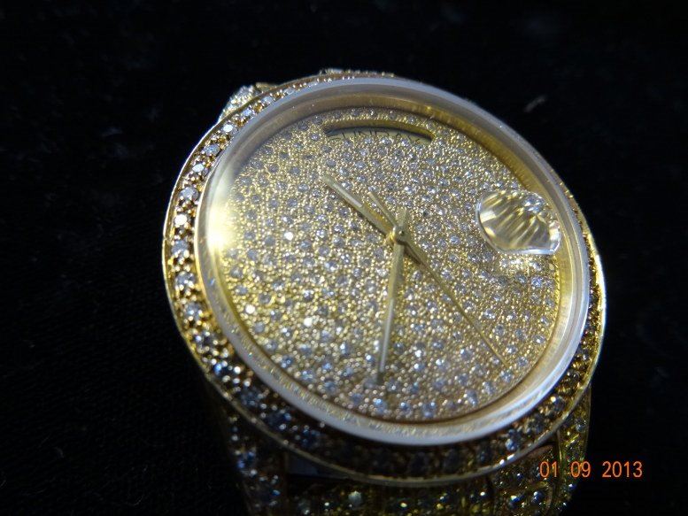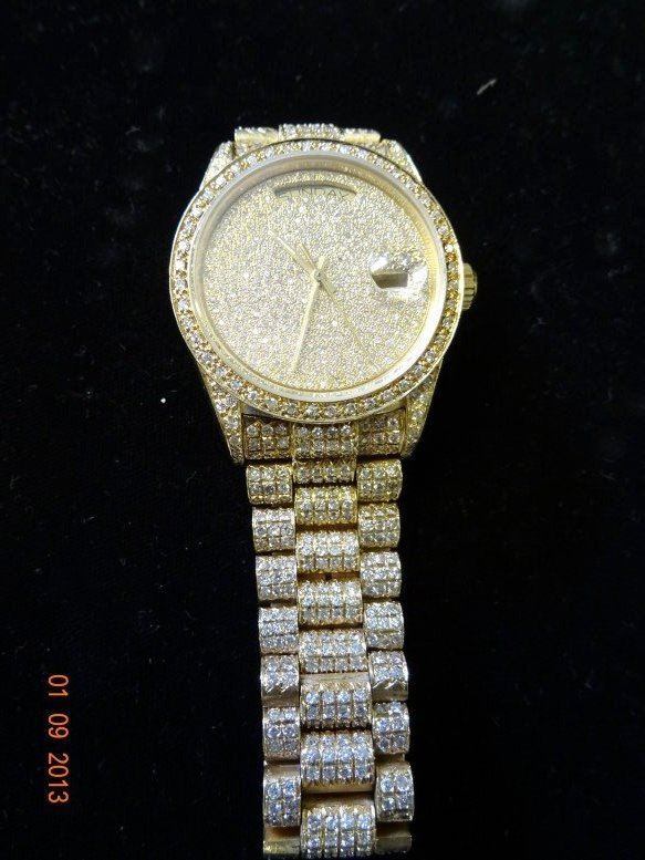 Pave Diamond Dial, Diamond Bezel, Pave Set Diamond Case & Lugs- President "Super Karat" Style Full Pave set Diamond Bracelet. Model # 18078 - S/N 9627363 - All of the diamonds are custom set and are not factory set by Rolex.The estimated total weight of diamond set in the watch is approx. 16 carats the diamonds are VS to SI Clarity Range. G-H-I color range.The serial number dates the watch to approx 1986. Total wgt of the watch 154.67 grams. - Est Insurance Replacement Value $26,000.00