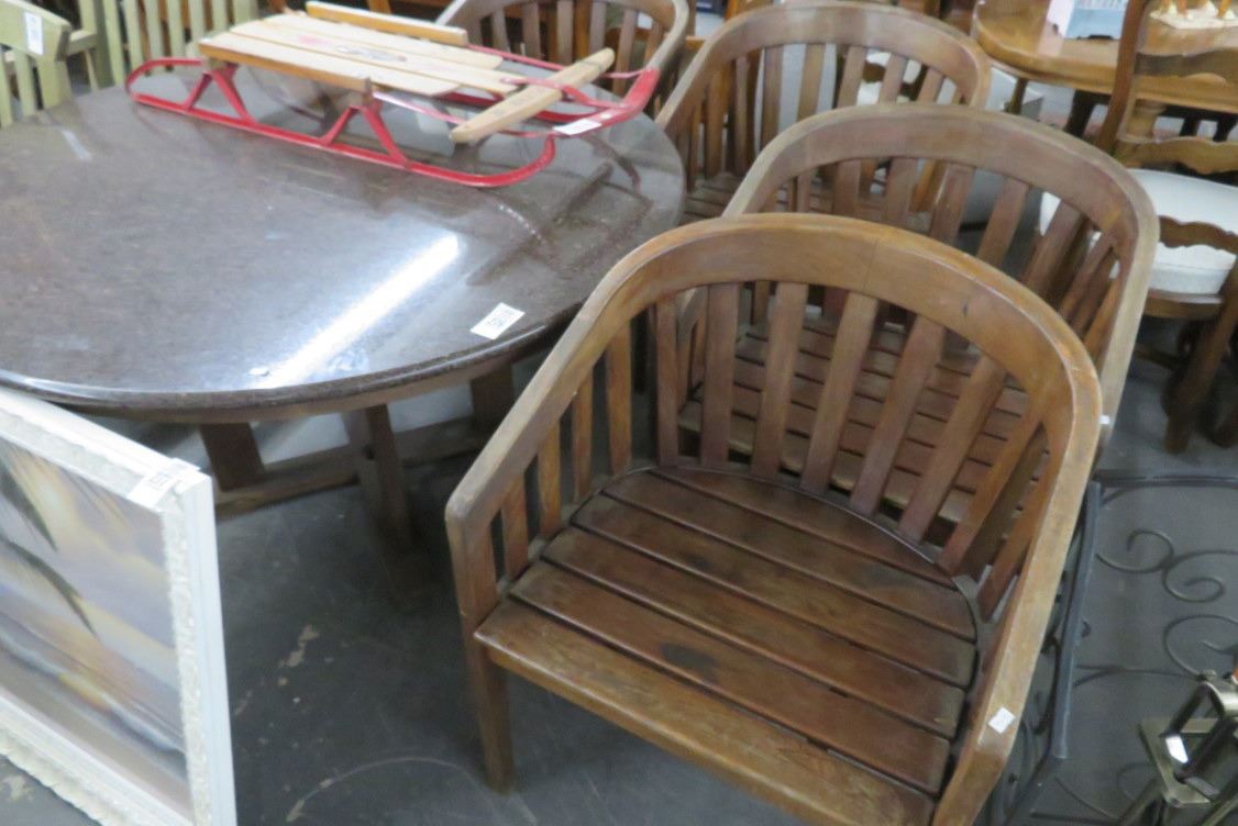 Round Granite Top Teak Table w/4 Teak Armchairs