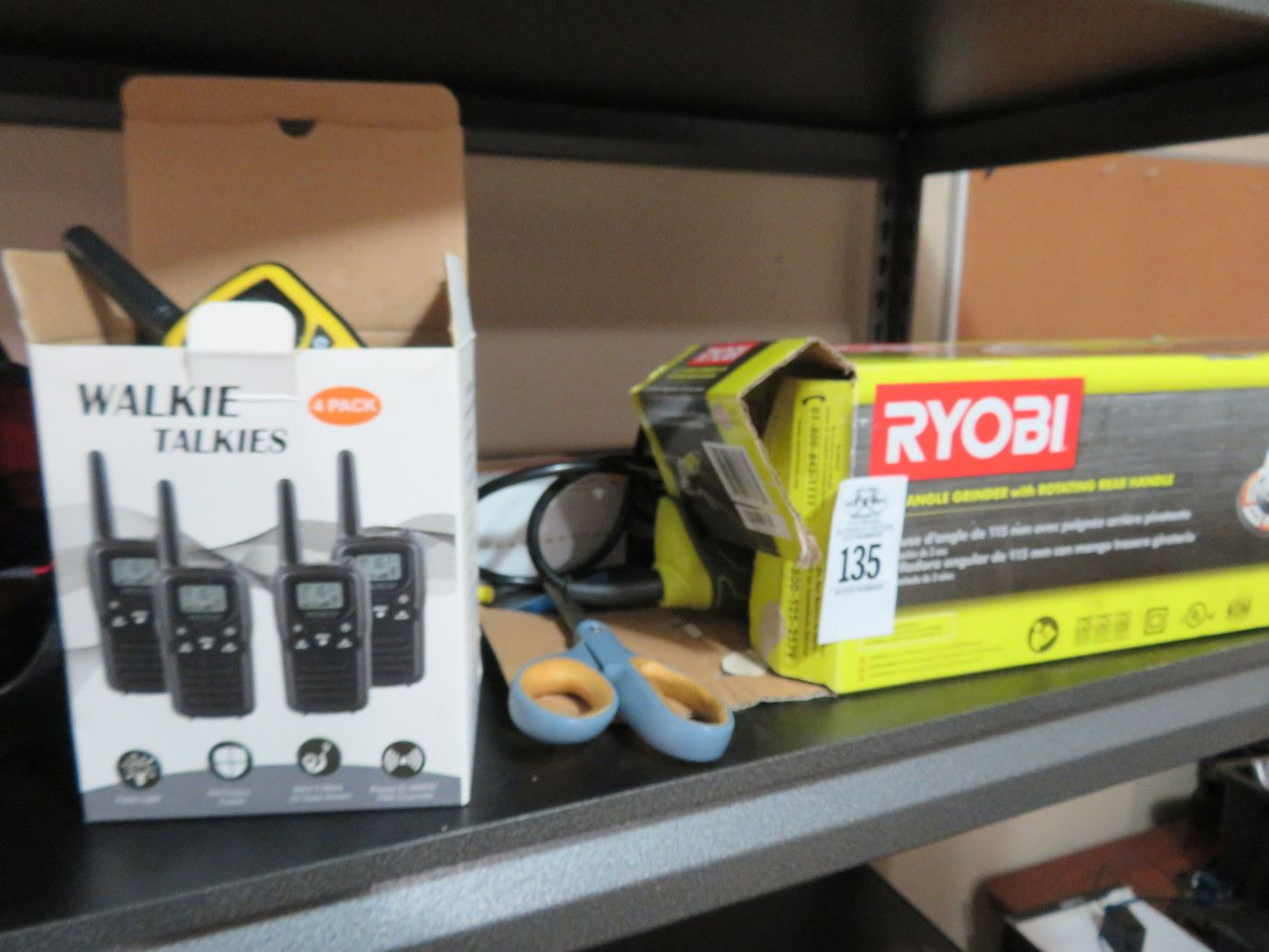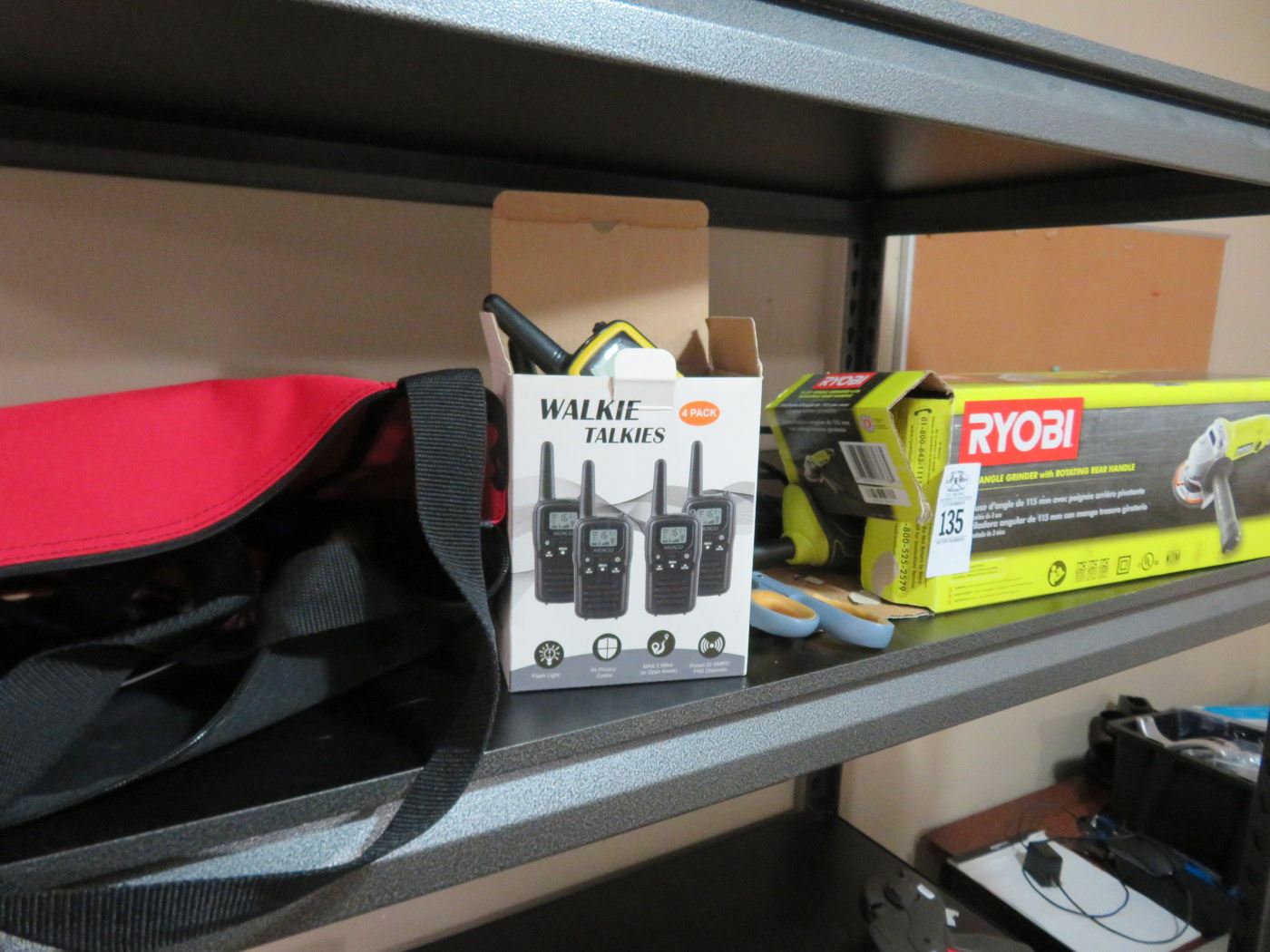Ryobi Angle Grinder, Walkie Talkies, Tote Bag w/Supplies
