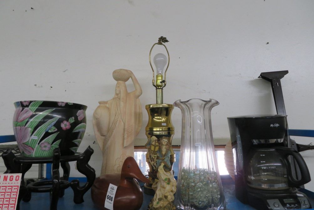 Shelf Lot of Asian Bowl On Stand, Brass Lamp, Wood