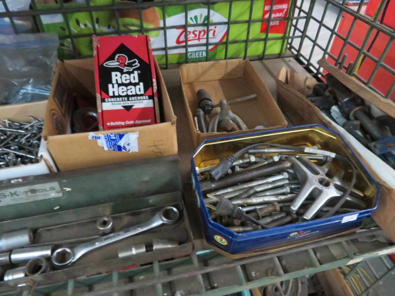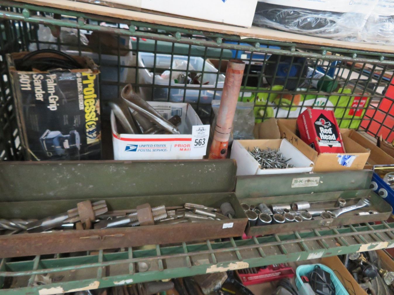 Shelf Lot of Asst. Tools, Hardware, B & D Palm Grip Sander