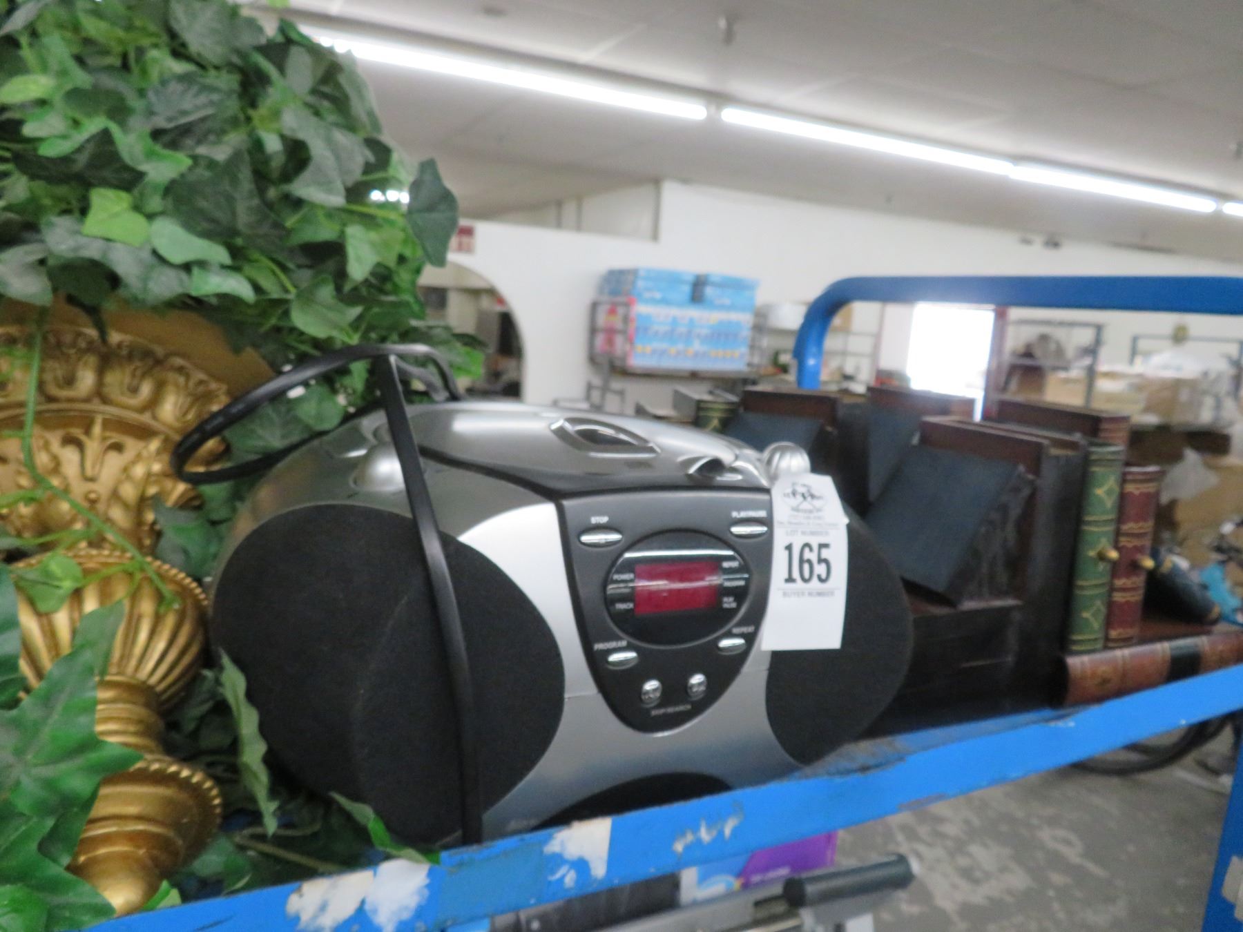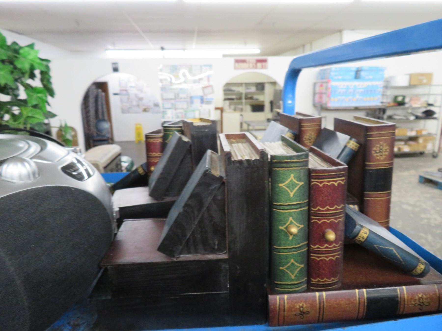 Shelf Lot of Decorative Planters, Stereo, Bookends & Lantern