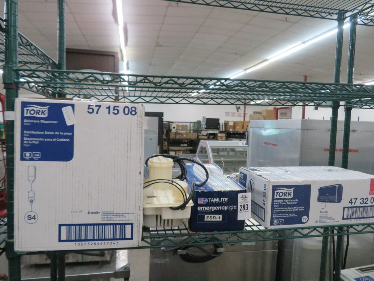 Shelf Lot of Soap/Tissue Dispensers & Emergency Light
