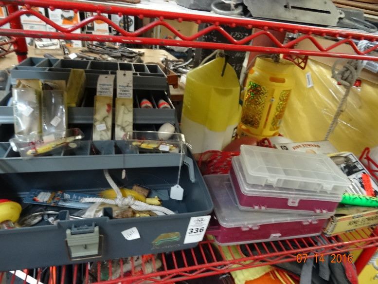 Shelf Lot of Tackle Boxes & Bait Buckets