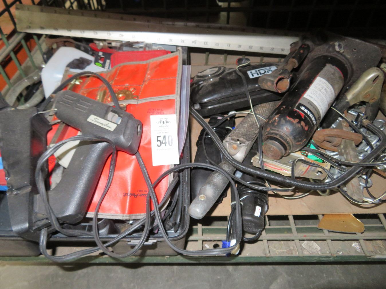 Shelf Lot w/Bottle Jack, Belt Sander, Chain & Asst. Tools