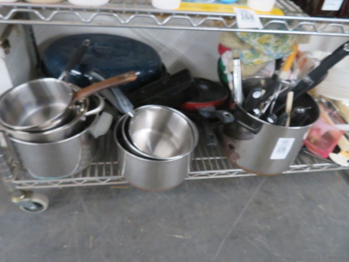 Shelf of Asst. Cooking Utensils, Saucepans & Fry Pans