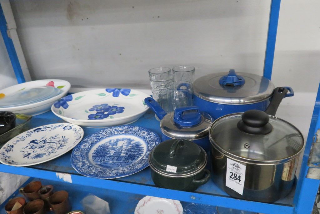 Shelf of Asst. Platters, Cups, Sauce Pans