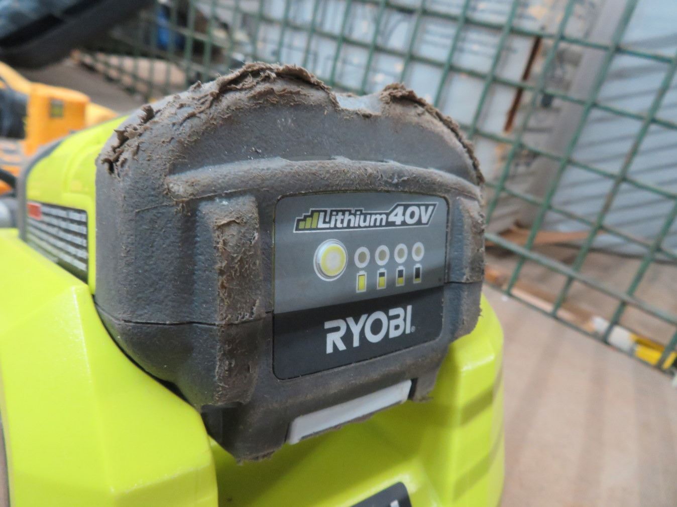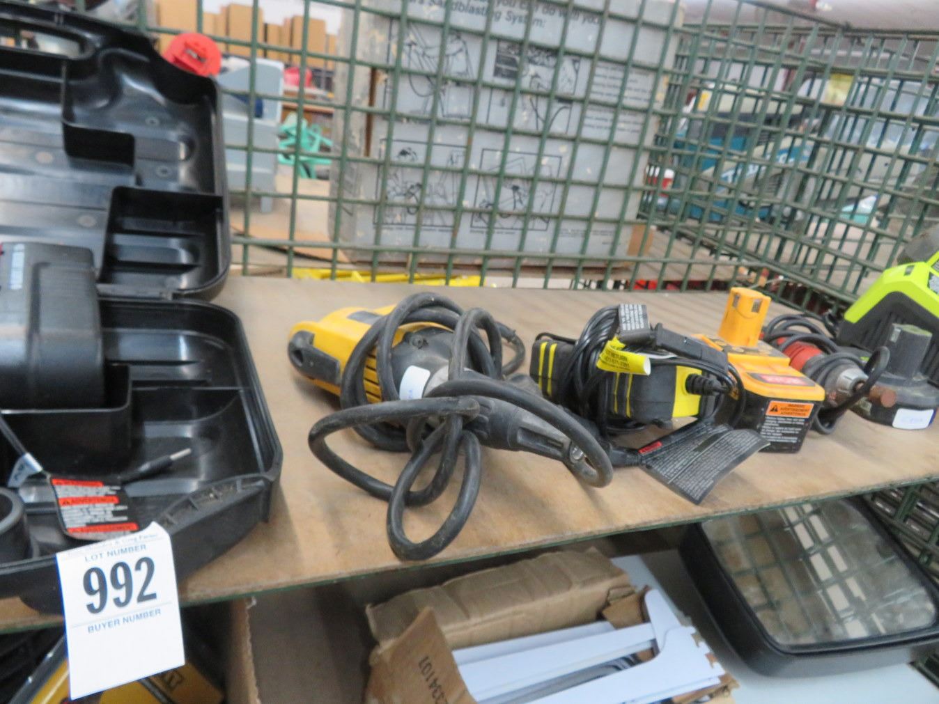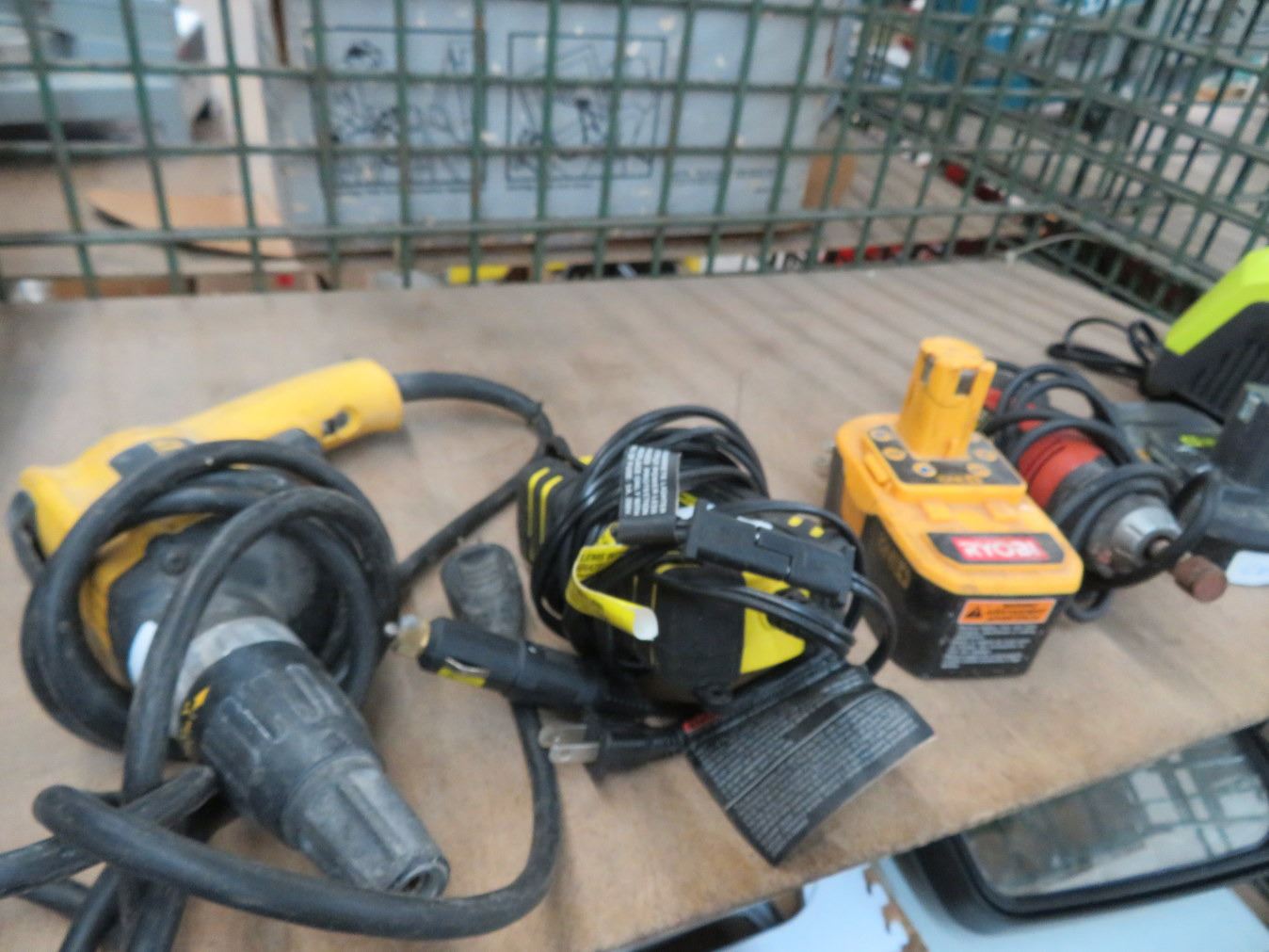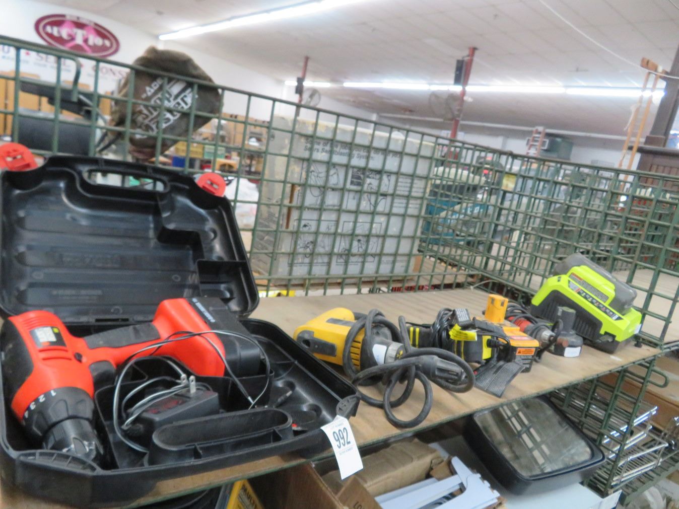 Shelf of Black & Decker Drill, Ryobi Battery Charger, Batteries