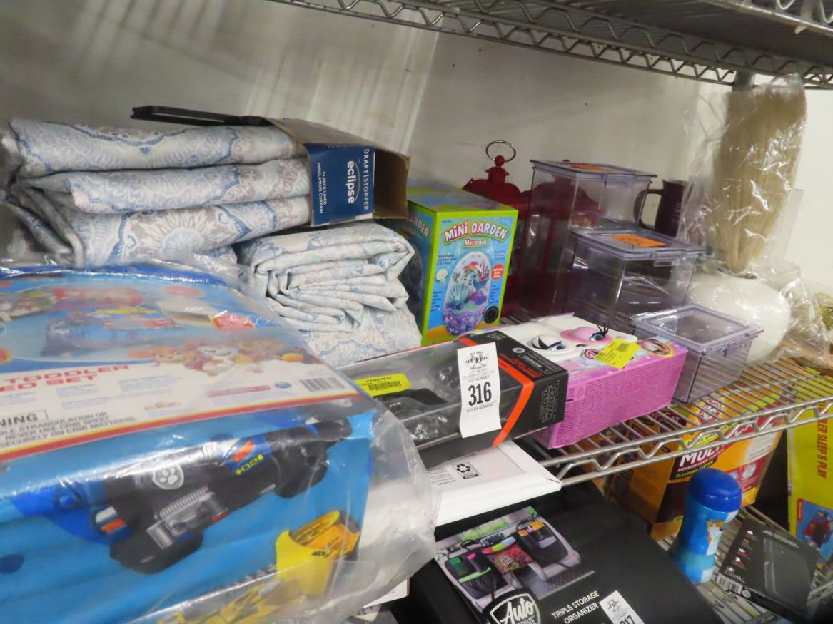 Shelf of Toddler Bed Set, Curtains, Star Wars Toy and Asst. Décor