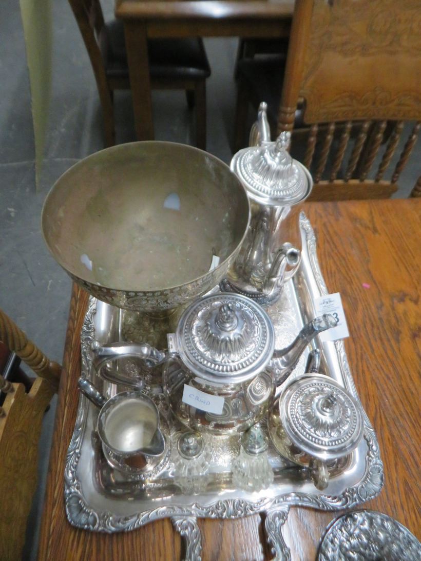 Silverplate Platter, Teapots, Creamer, Salt & Pepper Shakers