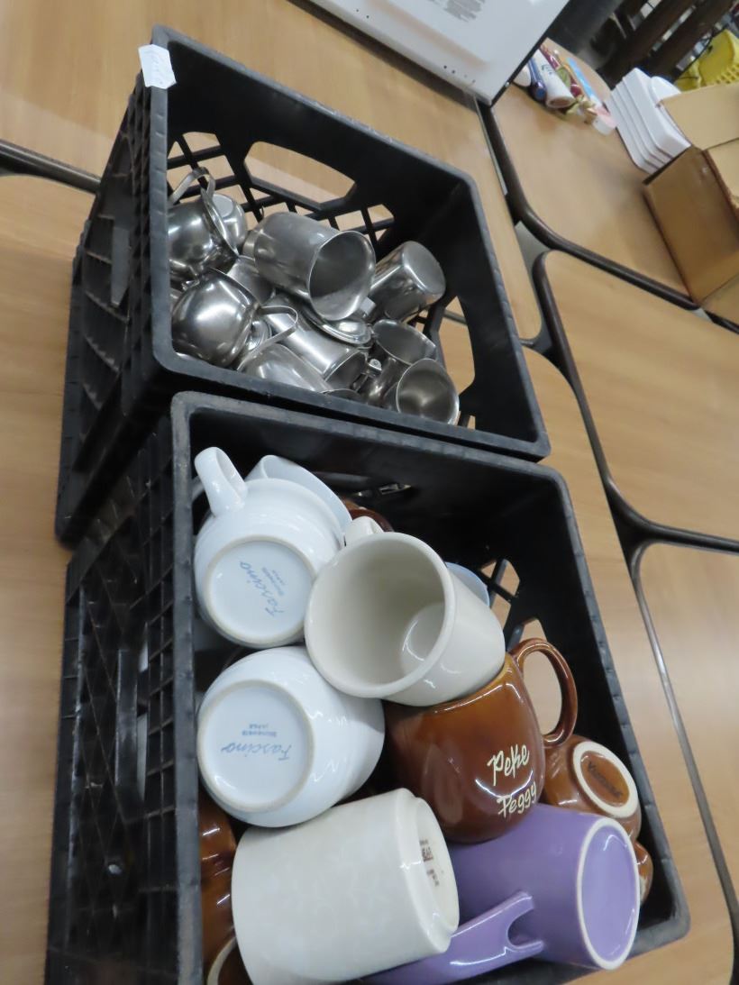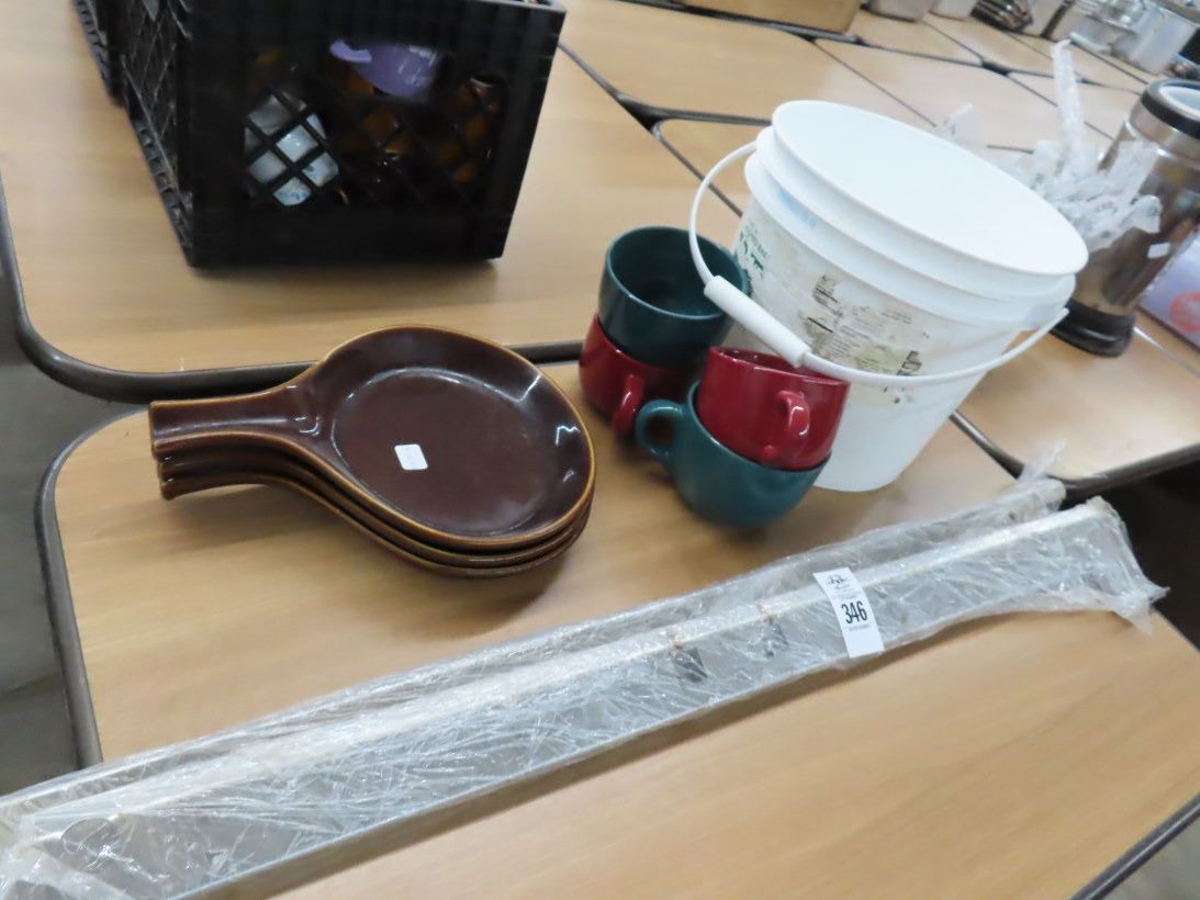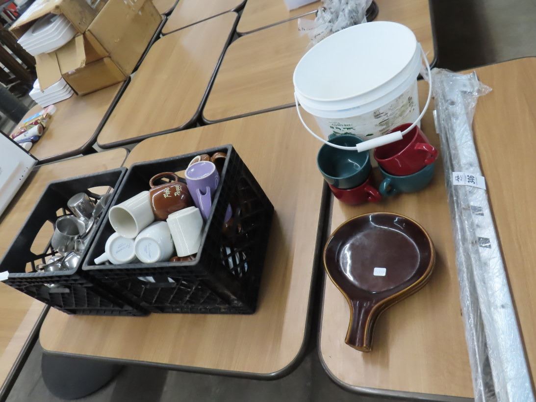 Soup Mugs, Earth Tone Bowls, Stainless Steel Supports, Coffee Mugs, Creamers