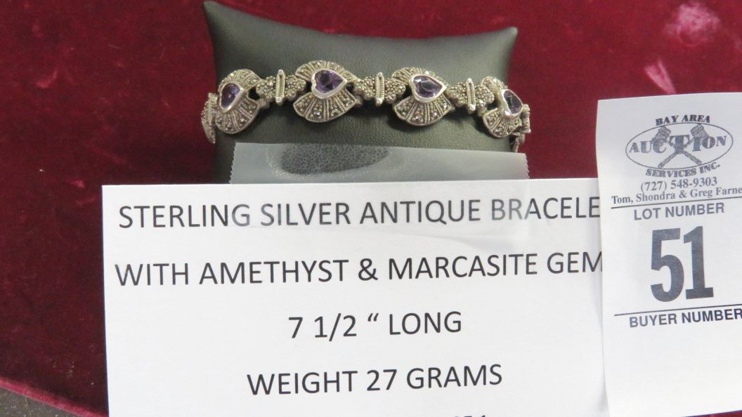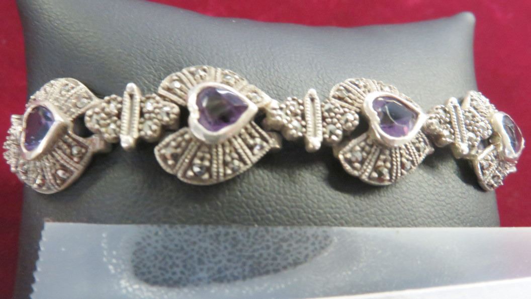 Sterling Silver Antique Bracelet w/Amethyst & Marcasite Gems