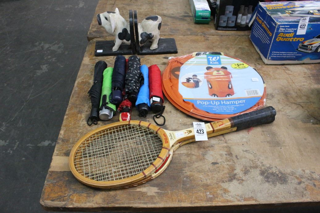 Tennis Rackets, Umbrellas, Hamper, Cow Bookends