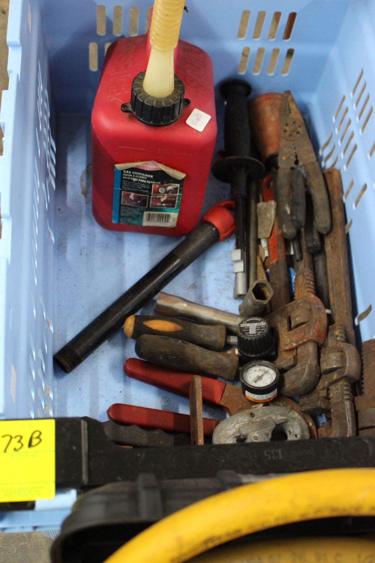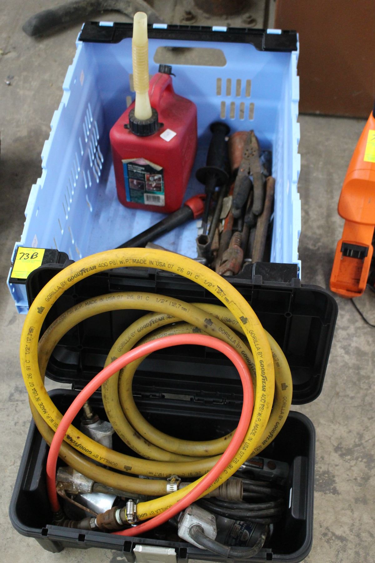 Toolbox w/Pneumatic Tools, Air Hoses, Tub of Plumbing Pipe Wrenches
