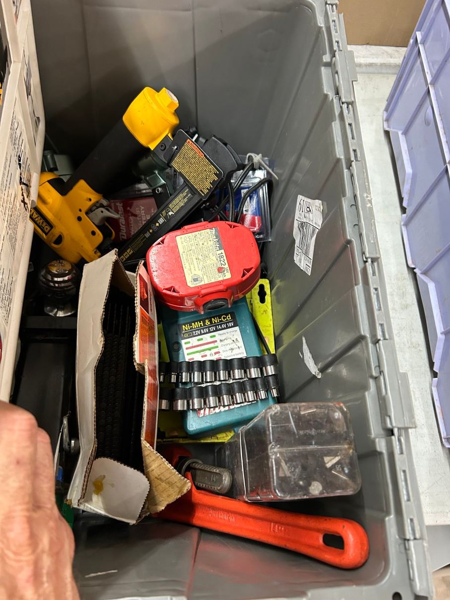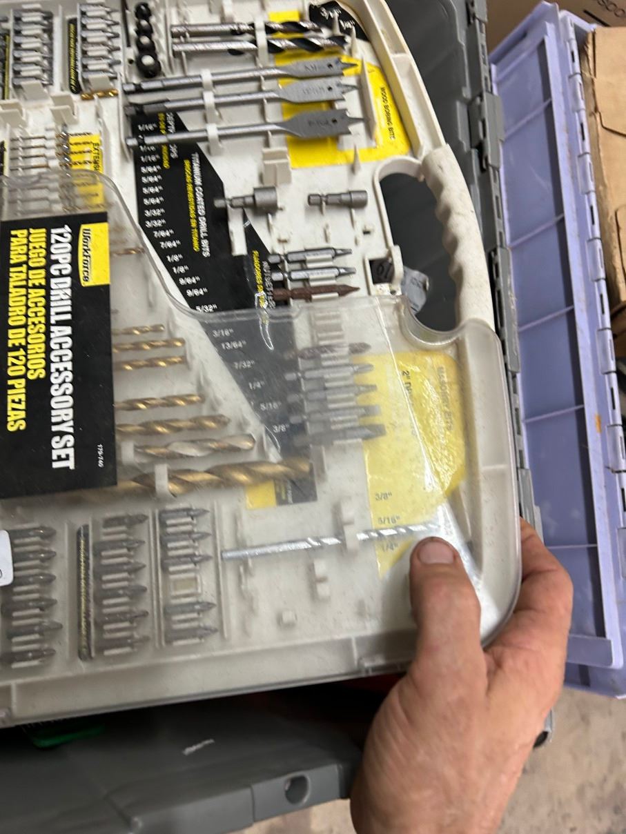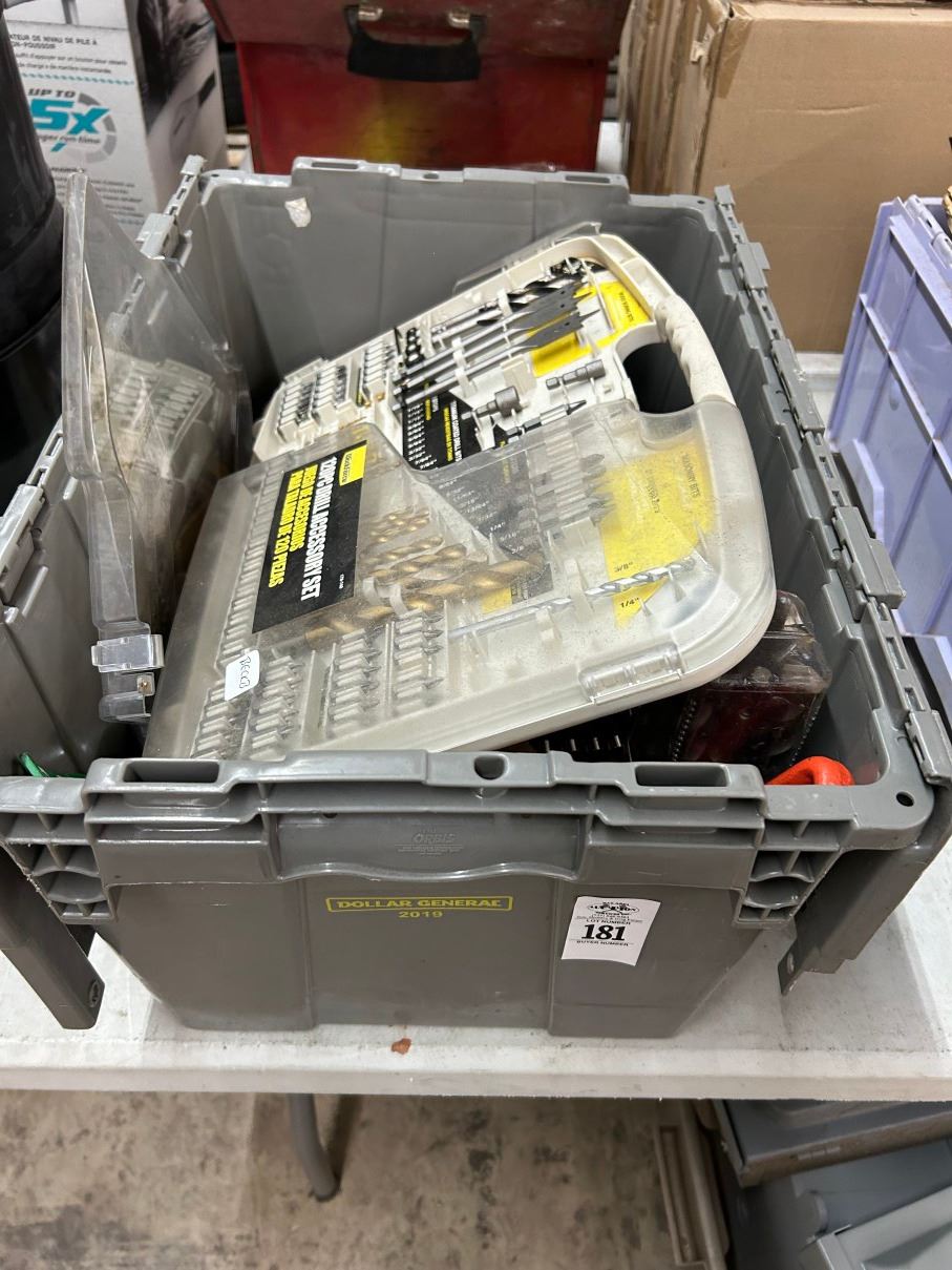 Tote w/Drill Bit Kit, Sockets, Air Nailer, Tools