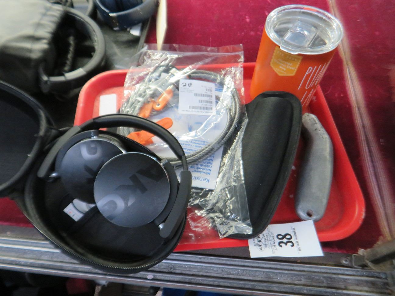 Tray Lot of AKG Headphones, Lock, Mug and Mouse Pad