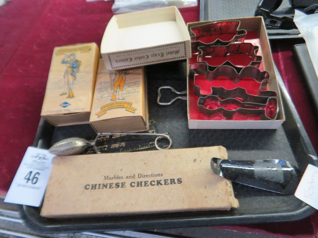 Tray Lot of Cookie Cutters, Matches & Chinese Checkers