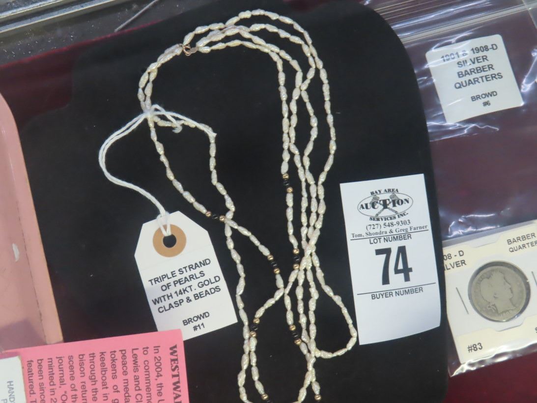 Triple Stand Pearl Necklace w/14K Clasp and Beads
