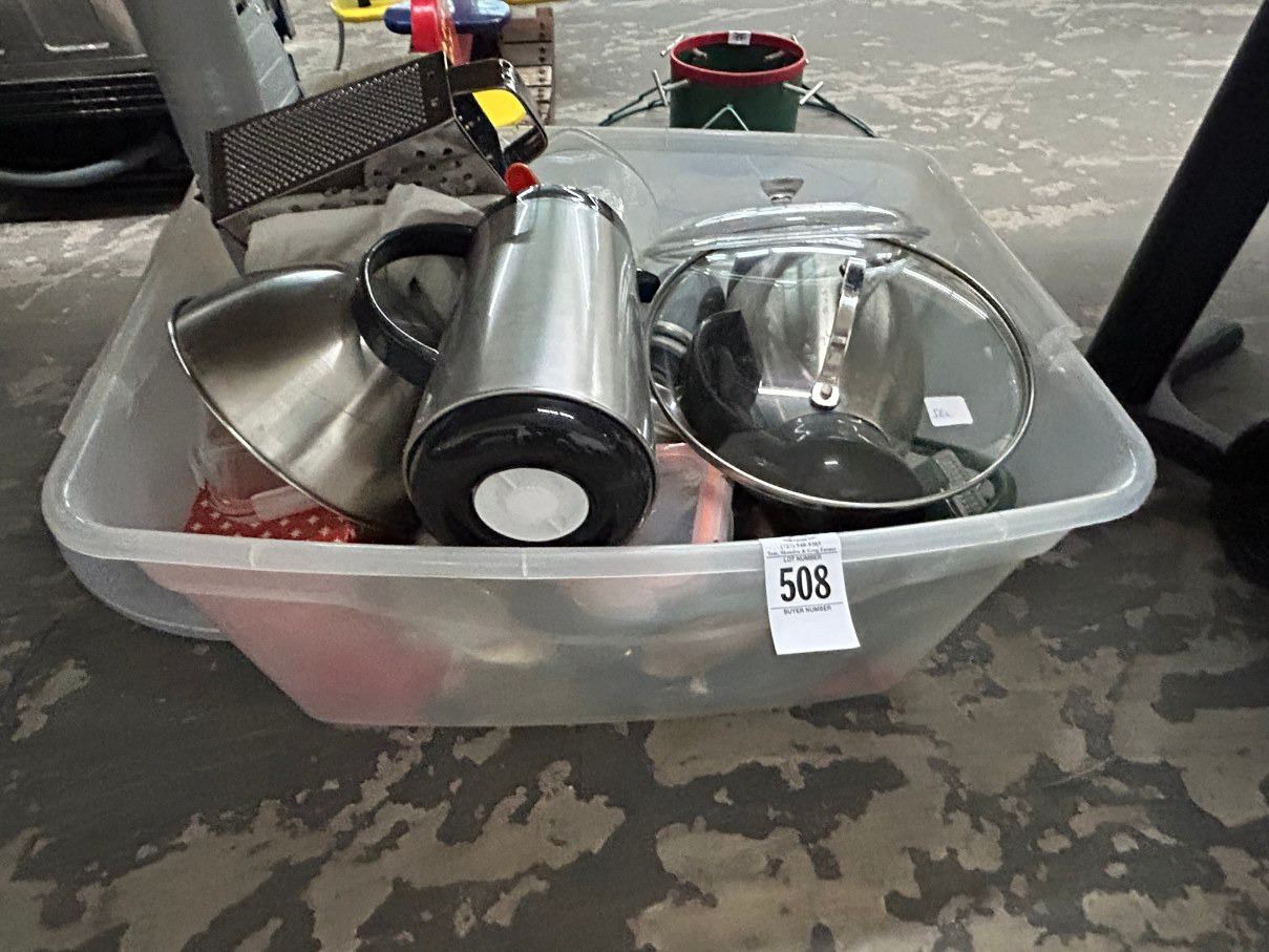 Tub w/Cookware, Kitchen Items