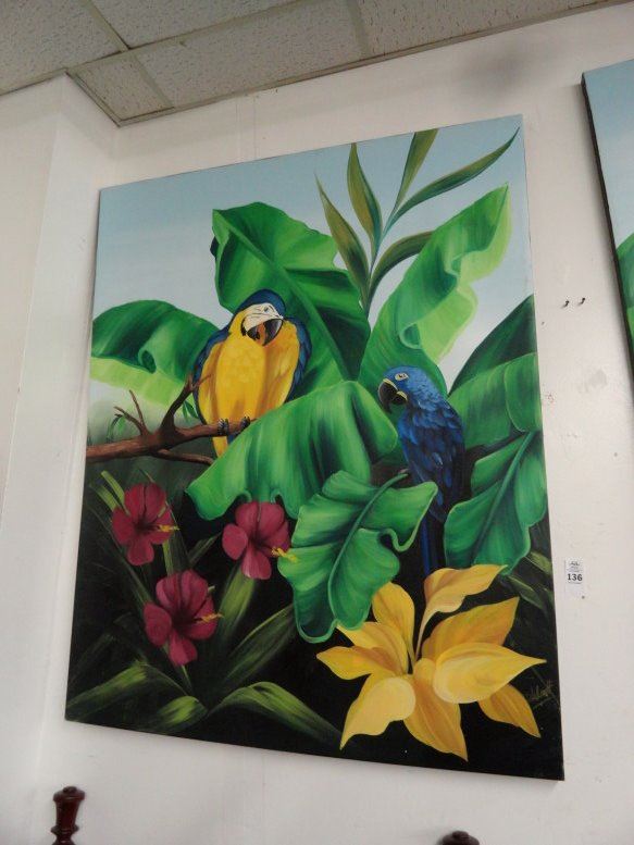 Unframed Large Oil On Canvas Parrots