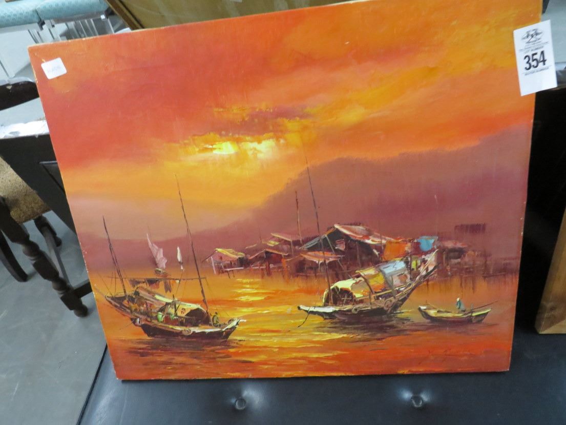 Unframed Oil On Canvas Oriental Junks Y. Ryder - 18 x 20