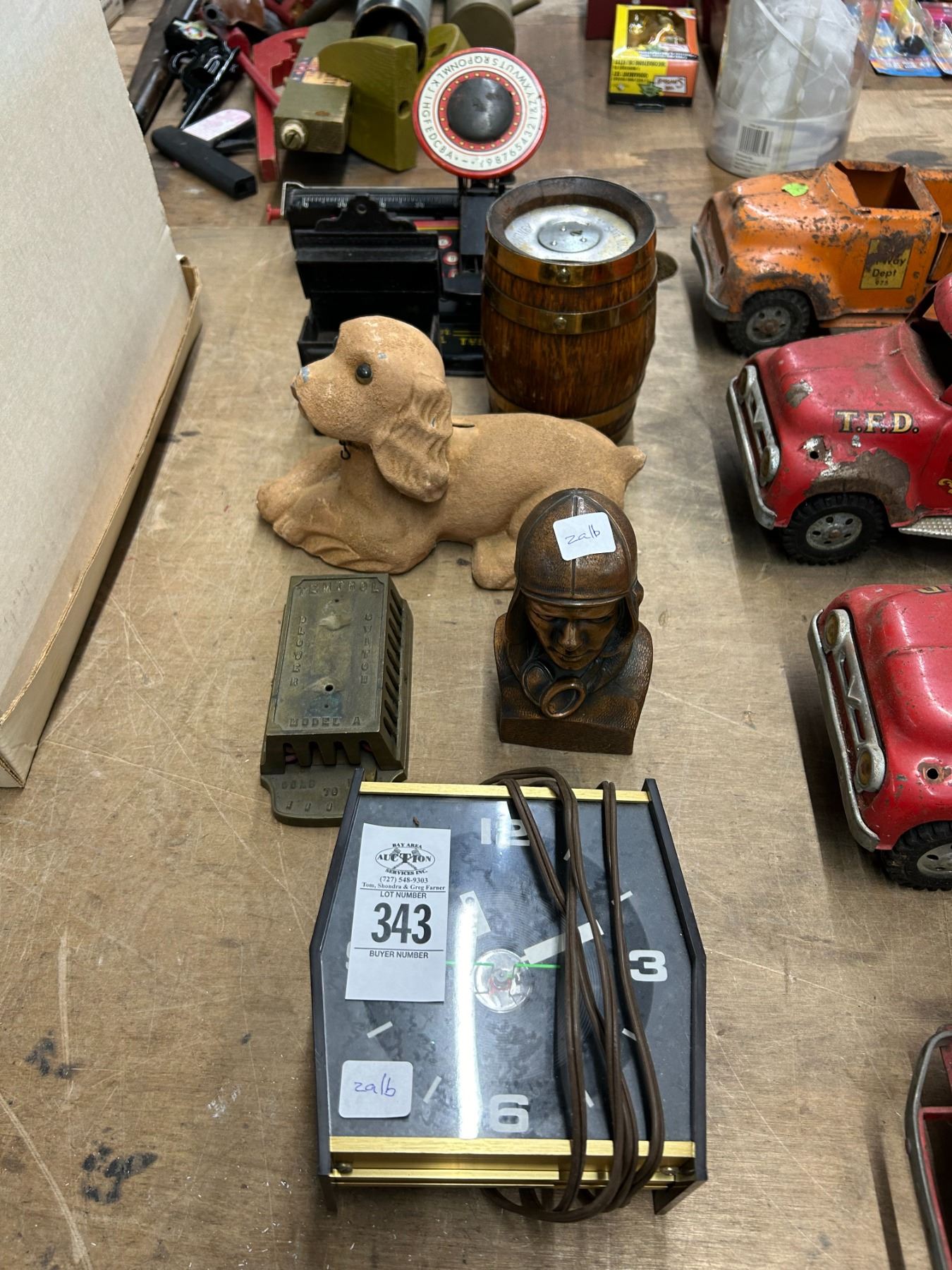 Vintage Cast/Brass Thermastat, Tin Litho Typewriter, Coin Banks, Alarm Clock