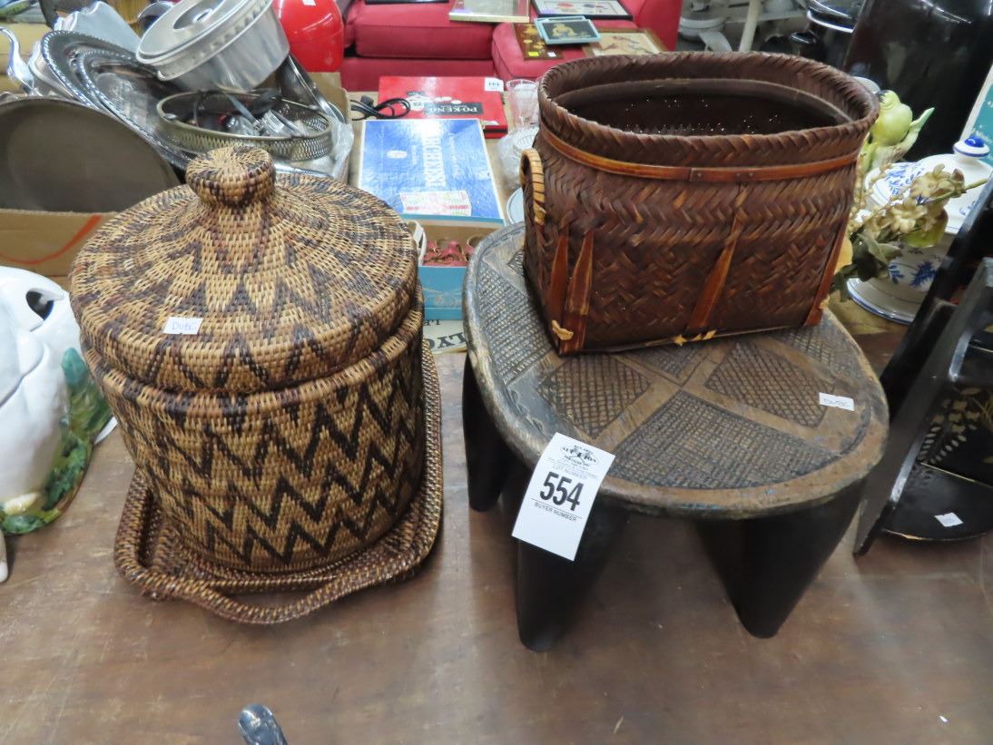 Wicker Baskets, Carved Stool