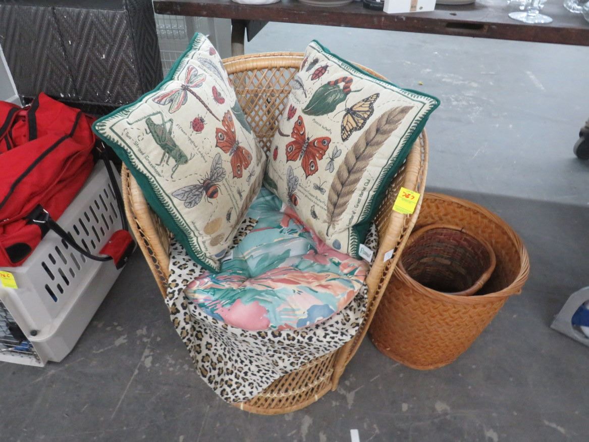 Wicker Round Small Chair, Butterfly Pillows, Basket