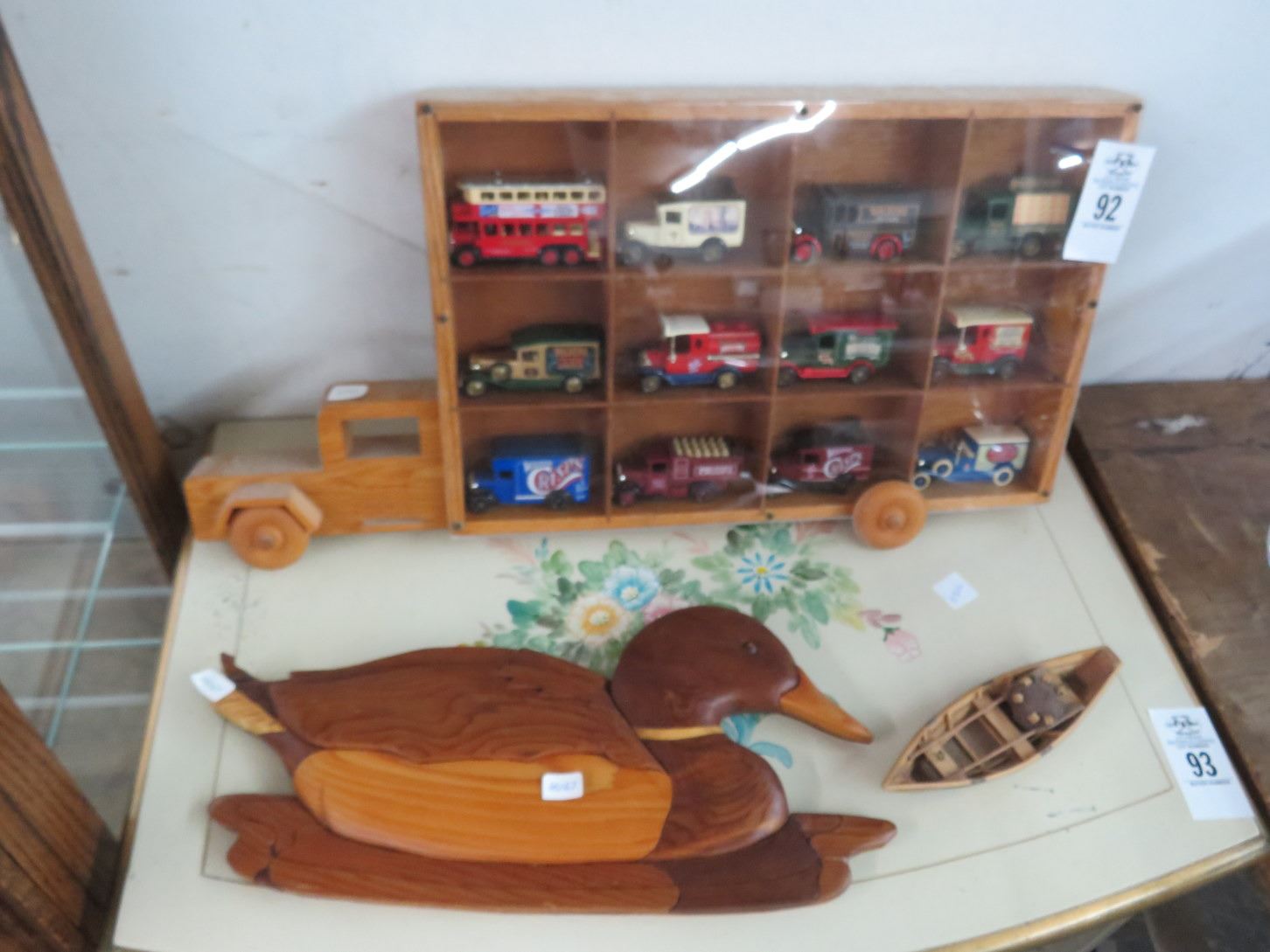 Wooden Truck Display w/Die Cast Trucks 12, Carved Duck & Boat Décor